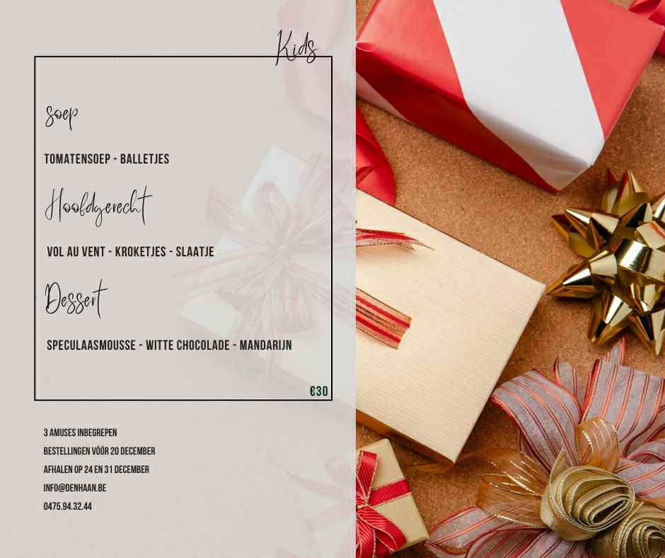 Op 24, 25 en 31 december, kunt u een Feestdagendiner bestellen om samen met uw geliefden van te genieten. Dit uitgebreide 4-gangen menu wordt geleverd met een gedetailleerde beschrijving zodat u elk gerecht in de gezelligheid van uw eigen huis kunt bereiden.